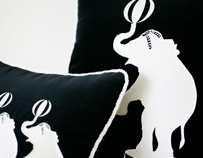 グラフィックのシルクプリントを施し、周囲にロープをあしらったスクエアクッションです。ビラブドの人気商品になります。